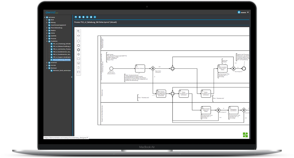 awino®EASY ist unsere Plattform zur Abbildung und digitalen Umsetzung von Prozessmanagement in Unternehmen. awino®EASY bietet die Möglichkeit zur Dokumentation, Ausführung sowie dem Monitoring und Reporting Ihrer Geschäftsprozesse. Die Dokumentation bzw. Modellierung von Prozessen erfolgt in der Prozessmodellierungssprache BPMN 2.0 (Business Process Model and Notation). awino®EASY läuft ohne lokale Installation im Browser und kann sowohl in der Cloud als auch als eigene Installation in Ihrem Unternehmen (On Premise) betrieben werden.