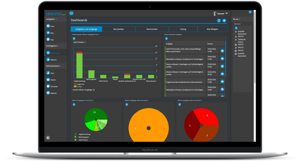 Eine dynamische und zeitnahe Prozesssteuerung ist das Mittel, um Prozesszeiten, Prozesskosten und Prozessqualität stets auf dem gewünschten Level zu halten. Steuerungsbemühungen im Nachhinein beschränken sich darauf, vermeidbare Fehler zu korrigieren. awino®EASY ermöglicht Ihnen eine zeitnahe Steuerung von Prozessen und Prozessbeteiligten durch Aufgaben- und Prozessmanagement.